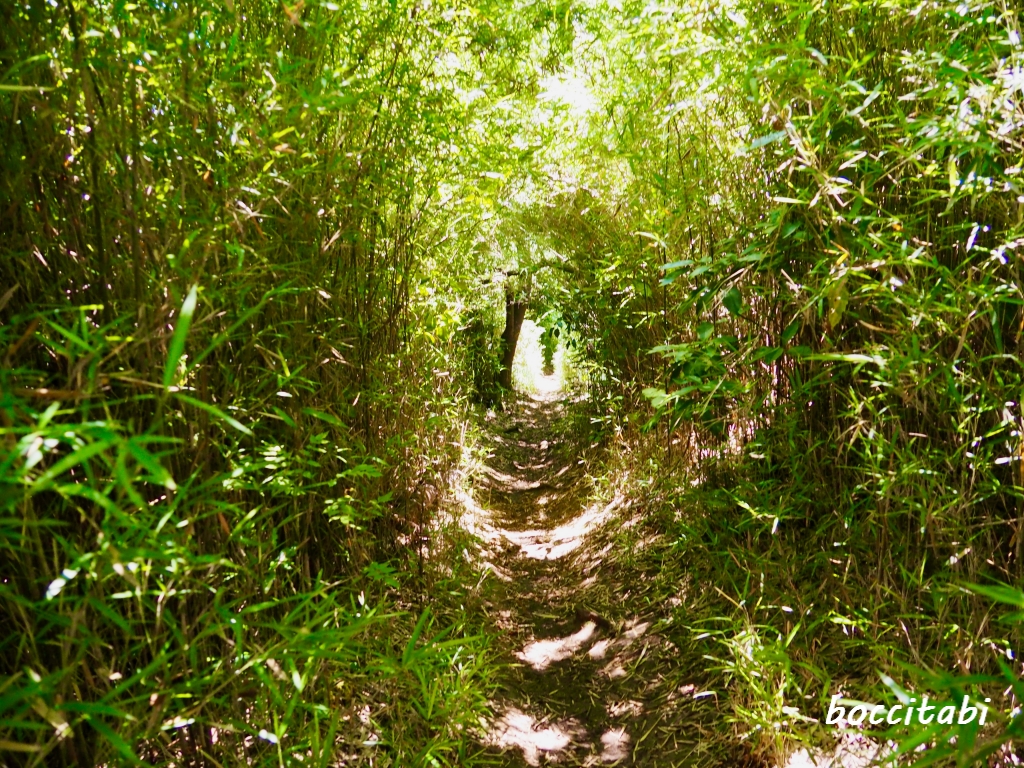 ハイキングコースの木漏れ日 道 笹薮 写真 フリー画像 無料素材