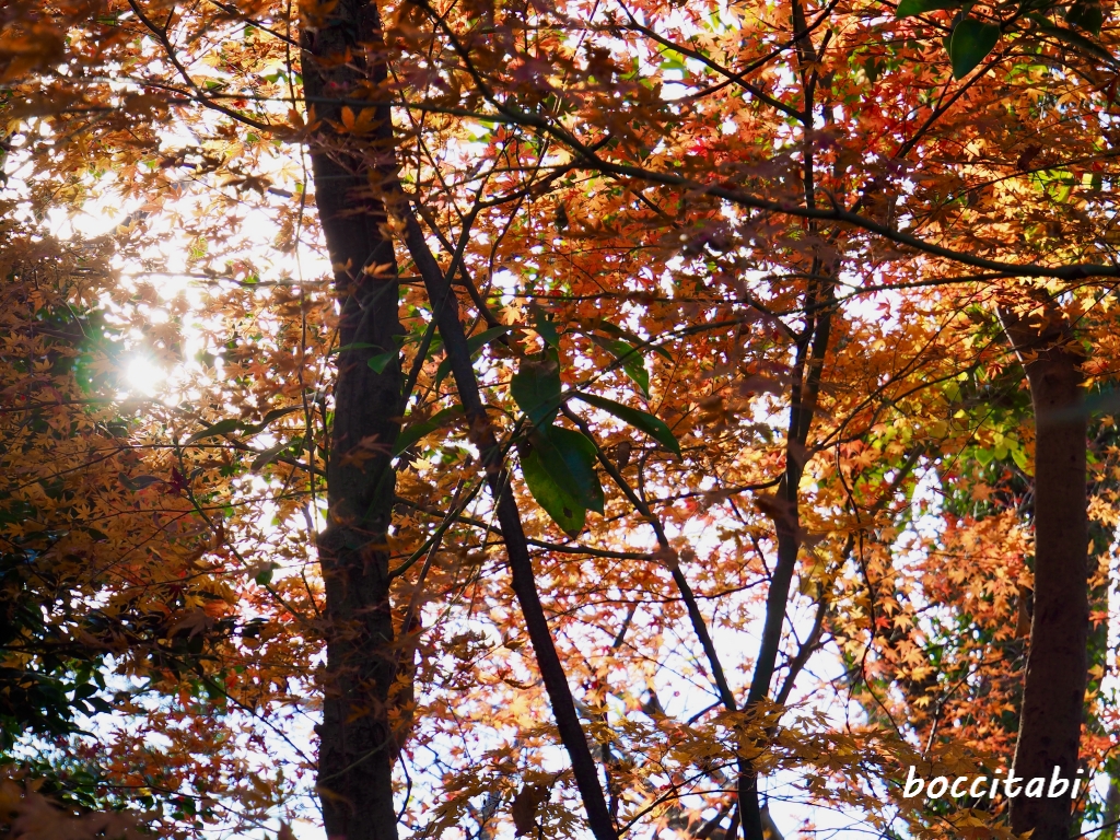 紅葉 林の中の木漏れ日 写真 フリー画像 無料素材